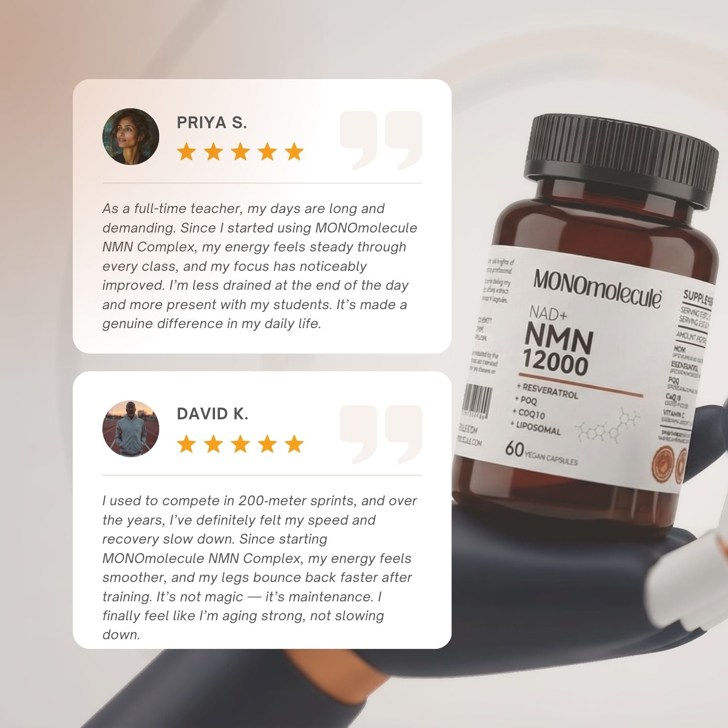 Individual results may vary, but many users of the MONOmolecule™ NMN Complex begin noticing measurable improvements in as little as 6 days of consistent use.*Early benefits often include enhanced sleep quality, morning energy, and mental clarity as cellular energy and mitochondrial function begin to optimize. With continued daily use, users frequently report steady improvements in focus, metabolic vitality, and a greater overall sense of well‑being over time.*Consistency is key — your body’s cellular systems adapt and strengthen progressively with sustained NAD⁺ support.